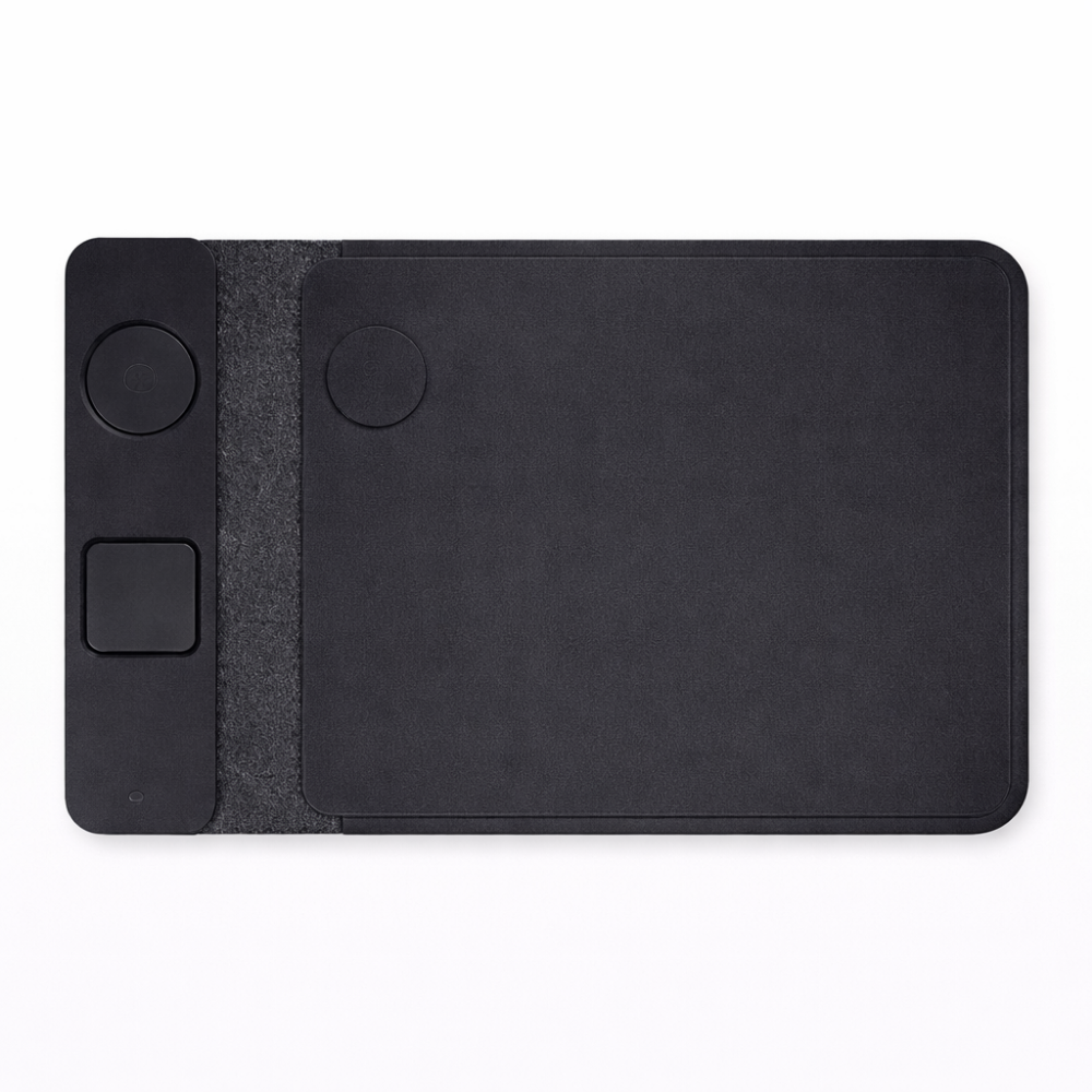 This multi-functional accessory serves as a protective computer bag and a desktop charging station. Crafted from premium PU leather, it features integrated 15W dual wireless charging and a magnetized closure, providing sophisticated comfort and usability for mobile professionals.