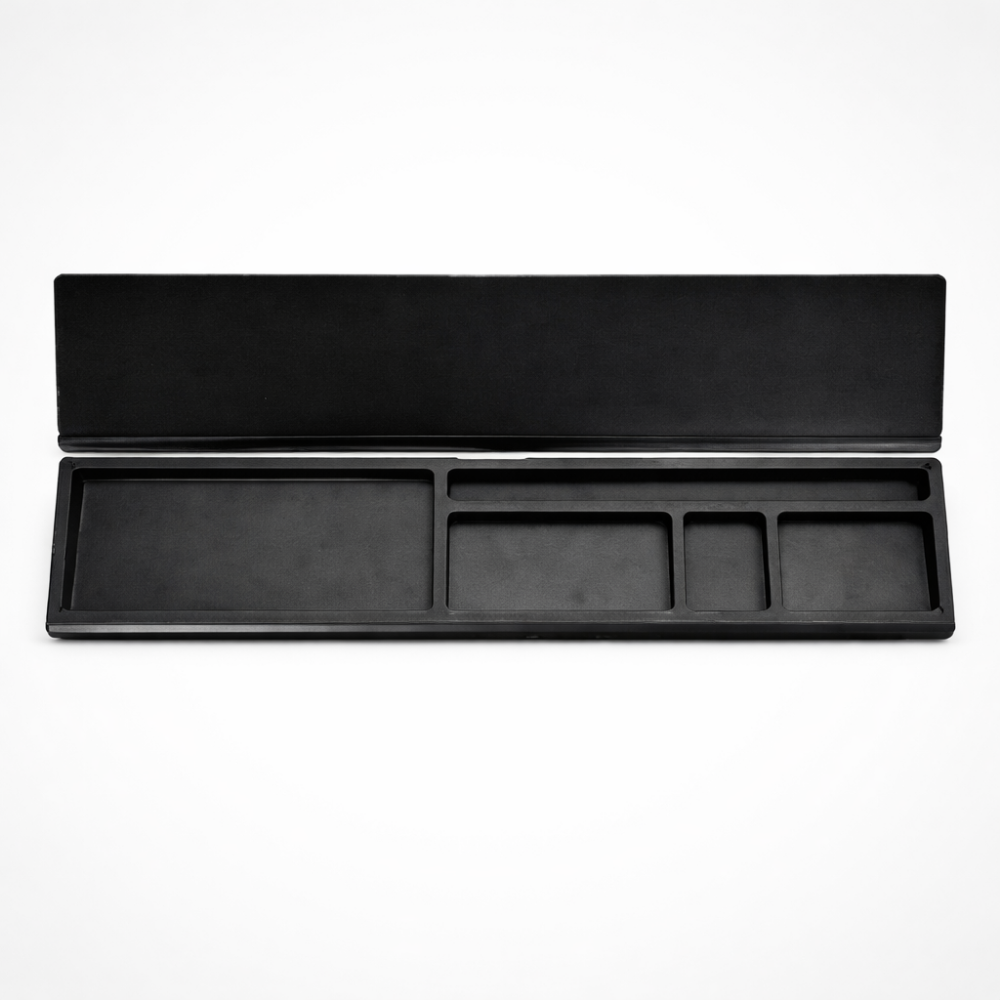 • Color & Design: Professional black finish with a flip-top lid that reveals internal storage zones.