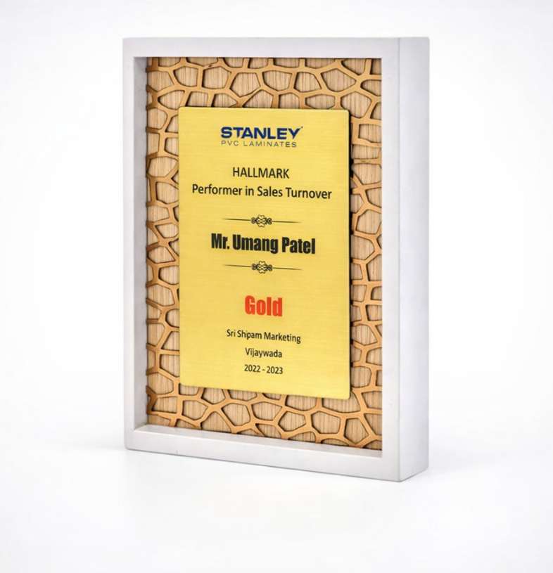 • Color & design: White outer frame with a gold central award plate.