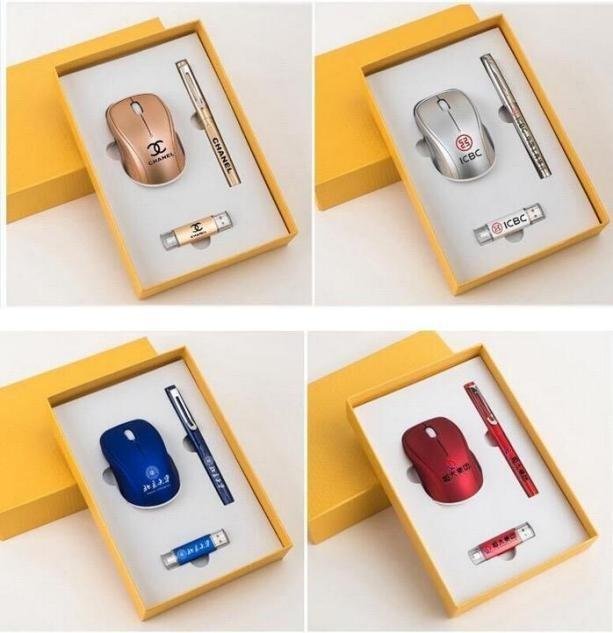 1. Brand-Ready Tech: A versatile 3-in-1 tech set with a wireless mouse, USB flash drive, and a pen, all ready for your custom branding.