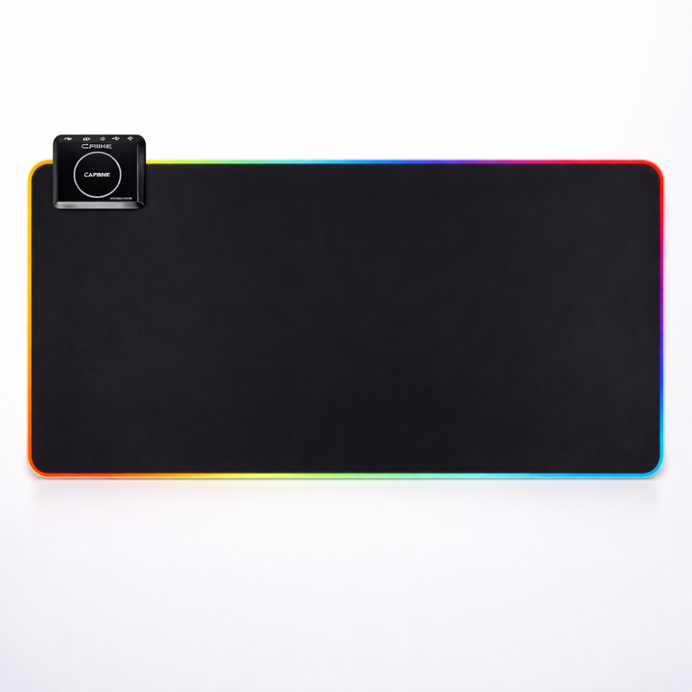 This expansive desk mat combines a dual USB HUB with customizable RGB lamp effects and an integrated wireless charging station. The durable material type ensures extensive surface protection and reliable mouse precision, anchored by a heavy-duty, high-traction rubberized base.